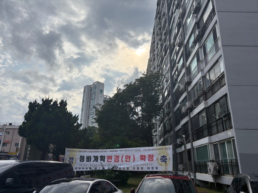 단지 내에 정비계획변경안 확정 축하 플랜카드가 걸려 있는 모습. 정주원 기자주택시장은 벌써 들썩이고 있다. 조합설립인가 직후 은마아파트 76㎡(이하 전용면적)는 36억~37억원대에서 거래가 활발했고, 84㎡는 41억~42억원대에서 손바뀜이 이뤄졌다. 은마아파트 단지 내 공인중개사무소 관계자는 “뉴스가 나온 뒤 문의가 급격히 늘었고, 주말에 집을 직접 보겠다는 사람들이 많아졌다”며 “다만 대출 규제로 매수자가 6억원 이상을 조달하기 어려워 실제 거래는 실수요 위주로 이뤄지고 있다”고 전했다.
