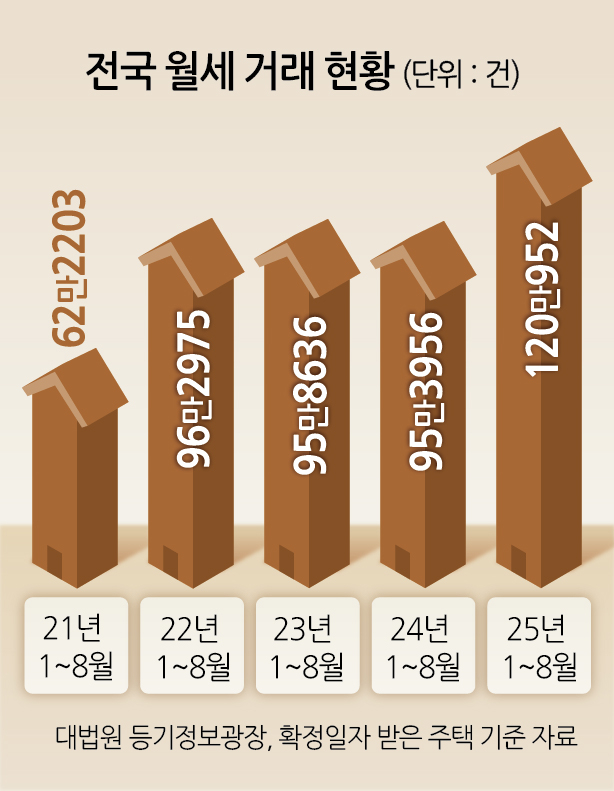 10일 대법원 등기정보광장에 따르면 올해 1~8월 확정일자를 받은 전국 주택 임대차 계약 가운데 월세를 낀 계약은 120만952건으로 집계됐다. 전년 동기(95만3956건)와 비교해 25.8%(24만6996건) 증가했다. 같은 기간 전국 월세 거래는 2020년 59만1619건에서 2021년 62만2203건으로 오름세를 이어가다 2022년 96만2975만건으로 껑충 뛰었다. 이후 2023년 95만8636건, 2024년 95만3956건으로 지난 3년간 비슷한 수준을 유지하다가 올 들어 25.8% 급증하며 120만건을 넘겼다.