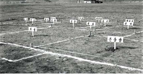 1975년 잠실 택지에 설치된 시영아파트 평면 구성. '온돌방' '거실' '변소(화장실)' '창고'등의 푯말이 보인다. 당시의 '모델 하우스'였던 셈이다. [사진 서울역사박물관] 76년 정부는 아파트만 지을 수 있는 ‘아파트 지구’ 제도까지 도입했다. 11개 지구를 지정했는데 6개가 강남이었다. 사실상 강남 아파트 개발을 위한 것이었다.