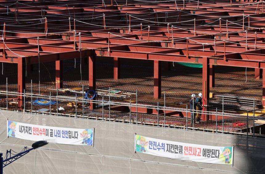 지난 달 25일 부산 수영구의 한 공사현장에 작업자들의 안전수칙 준수를 강조하는 현수막이 걸려 있다./연합뉴스 지난 6일에는 롯데건설이 시공 중인 경남 김해 아파트 신축공사현장에서 하청업체 소속 50대 근로자가 굴착구간 주변에서의 살수 작업 중 굴착기 삽에 맞아 사망했다. 4일에는 대우건설이 시공하는 울산 북항터미널 현장에서 LNG탱크 상부 데크플레이트에서 바닥 청수하던 근로자가 의식 잃고 쓰러졌다. 온열질환이 의심됐고, 병원으로 이송됐지만 숨졌다. 현재 부검과정이 진행 중으로, 2~3개월 뒤 정확한 사인이 밝혀질 예정이다. 하루 전인 3일 GS건설의 서울 성동구 신축 아파트 공사현장에서 사고가 났다. 50대 중국인 근로자가 15층 높이에서 외벽 거푸집 설치 작업 중 추락했고, 심정지 상태로 병원에 이송됐지만 끝내 사망했다.