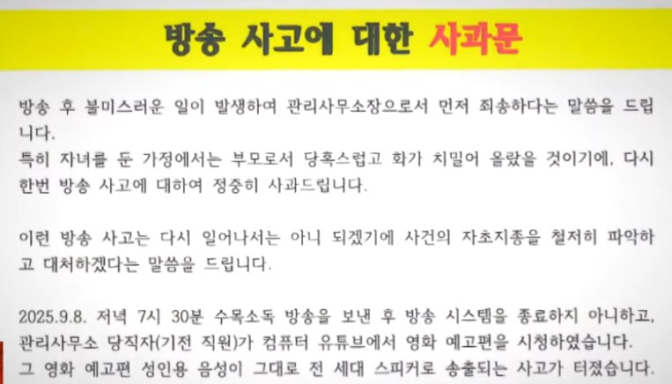 이어 "특히 자녀를 둔 가정에서는 부모로서 당혹스럽고 화가 치밀어 올랐을 것이기에 다시 한번 방송 사고에 대하여 정중히 사과드린다"며 "이런 방송 사고는 다시 일어나서는 아니 되겠기에 사건의 자초지종을 철저히 파악하고 대처하겠다는 말씀을 드린다"고 밝혔다.