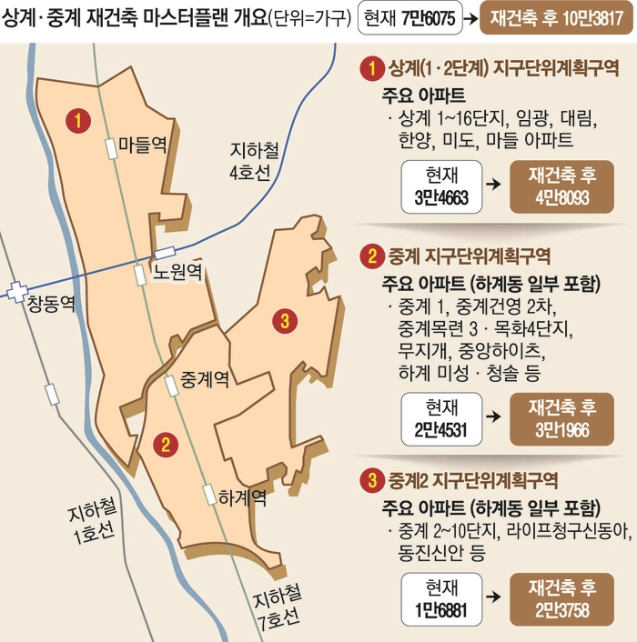 계획대로 재건축되면 현재 7만6075가구로 구성된 이 일대는 10만3817가구로 늘어난다. 상계(1·2단계) 구역의 21개 단지 3만4663가구는 4만8093가구로 증가한다. 중계지구는 2만4531가구에서 3만1966가구로, 중계2지구는 1만6771가구에서 2만3758가구로 주거 단지가 확대된다.