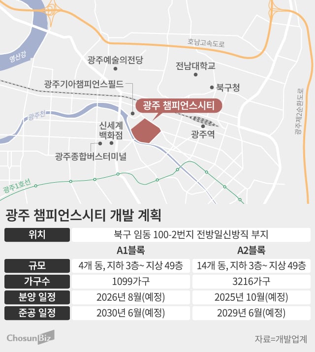 챔피언스시티 개발사업은 광주 북구 임동 100-1번지 일대 전방·일신방직 부지 약 29만㎡에 주거·업무·상업시설을 포함한 총 4315가구 규모의 주상복합단지를 조성하는 사업이다. 2개 블록으로 나뉘어 개발되는데 A1블럭은 4개 동, 지하 3층~지상 49층 1099가구로, A2블럭은 14개 동, 지하 3층~지상 49층 3216가구로 각각 조성된다. A2블럭은 다음 달 착공·분양해 2029년 6월 준공 예정이었고, A1블럭은 2026년 8월 착공·분양해 2030년 6월 준공 예정이었다.