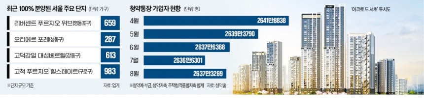 정부가 앞서 고강도 ‘가계부채 관리 방안’(6·27 대책)을 통해 대출 문턱을 높인 것도 청약에 대한 관심을 높이는 요인으로 꼽힌다. 수도권 주택담보대출 한도가 6억원으로 묶여 기존 아파트 매수가 힘들어져서다. 청약 당첨 이후 잔금대출도 6억원 한도가 적용되지만, 잔금을 치르기까지 자금을 마련할 시간을 벌 수 있다. 청약 수요가 커지면서 지난달 전체 청약통장 가입자 수(2637만3269명)는 5개월 만에 반등했다. 그러나 청약 당첨 확률 하락 속에 가입 기간 6개월 미만 가입자가 계속 줄어드는 등 가점이 낮은 청년층은 이탈하고 있다.