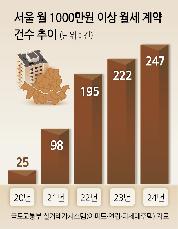 서울에서 1000만원 이상 고액 월세 계약은 2020년 25건에서 2021년 98건, 2022년 195건, 2023년 222건, 지난해 247건 등으로 매년 증가하는 추세다. 올해 연말까지 200건을 넘어서 300건에 근접할 것으로 예상된다. 지역별로는 용산구가 59건으로 가장 많았다. 이어 서초구(38건)·성동구(33건)·강남구(30건)가 뒤를 이었다.