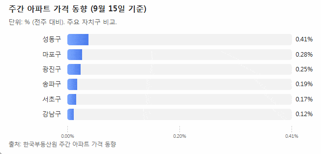 실제 전날 발표된 한국부동산원의 주간 아파트 가격 동향(9월 15일 기준)을 보면 성동구(0.27%→0.41%), 마포구(0.17%→0.28%), 광진구(0.20→0.25%) 등을 중심으로 한강 벨트권 여러 지역의 상승폭이 커진 상황이다. 이 기간 강남 0.12%, 서초 0.17%, 송파 0.19%를 일제히 앞지르며 상승폭을 키워가고 있는 것이다.