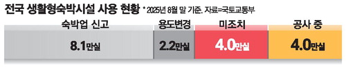 나머지 준공 물량 중 8만1000실은 숙박업 신고가 이미 완료됐고 2만2000실은 오피스텔 등으로 용도가 변경됐다. 원래 방침대로라면 미조치 4만실과 준공 중인 4만실 등 8만실은 이달 말까지 조치가 완료되지 않으면 2027년 이후부터 이행강제금(건축물 공시가격 10%)을 매년 내야 한다. 개인별로는 수천만 원에 달하는 과태료다.