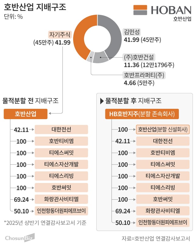 그래픽=손민균호반산업의 물적분할이 주목되는 다른 이유는 이번 물적분할이 호반그룹의 계열 분리를 위한 정지(整地) 작업이 될 수 있어서다. 호반산업은 대한전선, 호반티비엠(TBM) 등 8개 자회사를 갖고 있다.