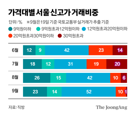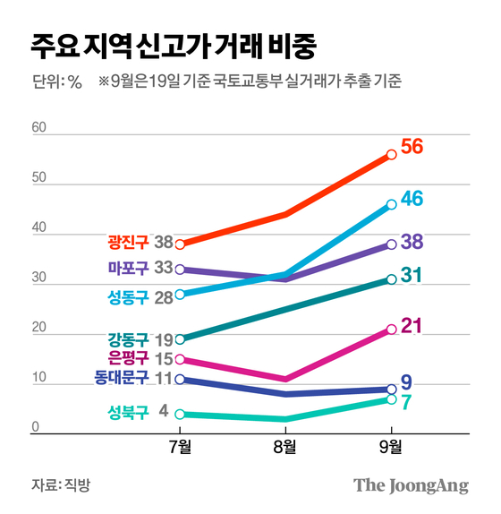 김경진 기자 실제 서울 아파트 매매 건수는 지난 6월 1만900건대에서 7월 3944건, 8월 4097건으로 절반 이상 줄었지만, 주요 지역의 신고가 거래 비중은 매달 늘고 있다. 직방에 따르면 성동구는 전체 거래 중 신고가 거래 비중이 지난달 32%에서 이달 46%까지 늘었다. 마포구도 31%→38%, 광진구는 44%→56%로 확대됐다.