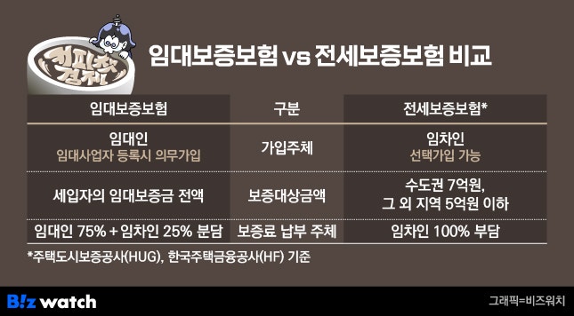 가입주체별 보증보험 종류 비교./그래픽=비즈워치큰 차이는 보험의 가입절차 및 보장방식에 있습니다. 임대보증보험은 집주인이 보험에 가입하지만, 실제 보험금을 받는 사람은 세입자입니다.