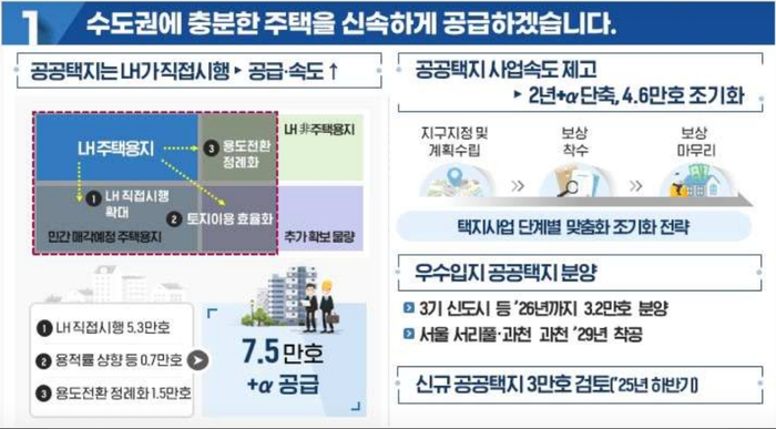 <자료=국토교통부>정부는 먼저 수도권 주택공급 확대와 조기화를 내걸었다. 공공택지는 LH(한국토지주택공사)가 직접 시행해 공급 속도를 높인다. 물량은 7만5000 호 이상 공급한다. 아울러 공공택지 4만6000호는 사업속도를 빠르게 진행하고, 우수입지인 3기 신도시에 2026년까지 3만2000 호를 분양한다. 서울 서리풀과 과천 과천지구는 2029년에 착공한다. 올 하반기에는 신규 공공택지 3만 호도 검토한다.