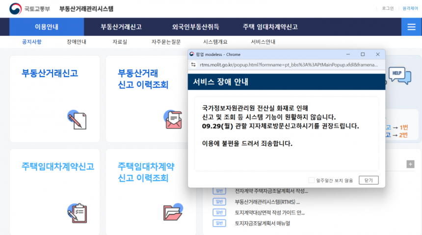 국가정보자원관리원 화재로 국토교통부 부동산거래관리시스템이 정상 작동하지 않고 있다. 사진=부동산거래관리시스템 갈무리