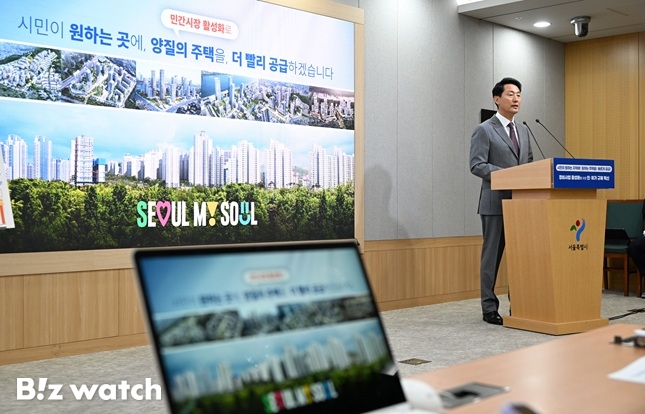 오세훈 서울시장이 29일 서울시청에서 열린 '서울시 주택공급 대책 기자설명회'에 참석해 발표하고 있다/사진=서울시 제공너는 너, 나는 나?