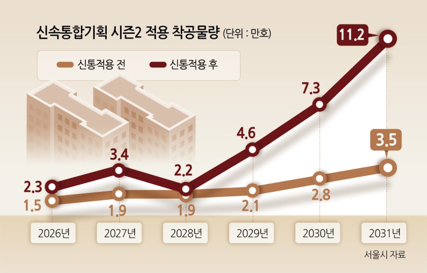 서울시는 이번 신통기획 시즌2로 정비사업 기간을 18년 5개월에서 12년으로 단축해 2031년까지 31만 가구 착공, 2035년까지 37만7000가구 준공을 목표로 사업을 추진하고 있다. 기존 정비구역 지정을 앞둔 사업장과 모아주택, 리모델링 물량까지 포함하면 최대 39만 가구 이상 공급도 가능하다는 것이 서울시의 주장이다.