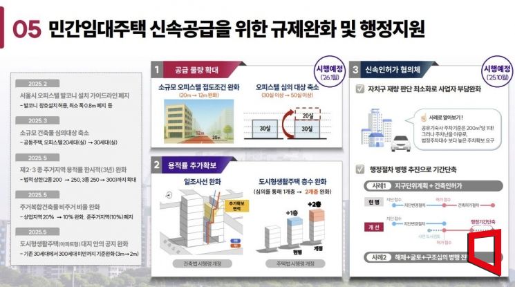 오피스텔 건축 때 건축위원회 심의 대상도 '30실 이상'에서 '50실 이상'으로 완화한다. 31~49실 중소규모 오피스텔도 심의 없이 빠르게 건축할 수 있도록 한다. 용적률 추가 확보를 위해 일조사선 규정 완화, 도시형생활주택 층수를 1개층에서 2개층까지 완화할 수 있는 방안 등도 정부에 건의한다.