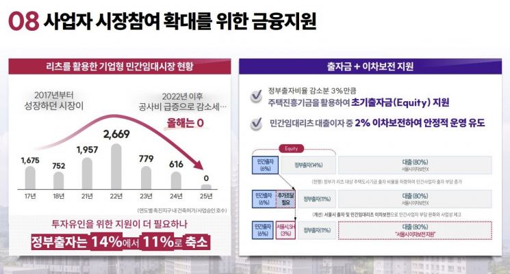 기업형 민간임대 사업자 시장 참여를 유도하기 위한 금융지원도 강화한다. 시는 사업자의 초기 출자금 부담을 줄이기 위해 정부의 민간임대주택 주택도시기금 출자 비율 감소분(14%→11%)만큼 서울주택진흥기금으로 민간임대리츠에 지원한다. 민간임대리츠 대출이자 중 2%는 이차보전해 안정적인 운영도 돕는다. 2022년 이후 공사비가 급증하면서 올해 리츠를 활용한 임대 공급량은 0건으로 집계됐다.
