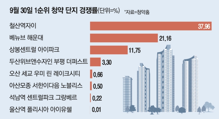 1일 청약홈에 따르면 전날 전국 8030가구를 대상으로 진행한 1순위 청약에 총 3만6165건의 청약이 접수돼 평균 4.5대1의 경쟁률을 기록했다. 이번 청약은 주간 기준 올해 최대 규모의 분양 물량인 데다 정부의 9·7 공급대책 발표 이후 도래한 본격적인 분양 성수기 물량으로 주목받았다. 추석 연휴 이후 청약시장 분위기를 가늠할 수 있는 척도이기도 했다.