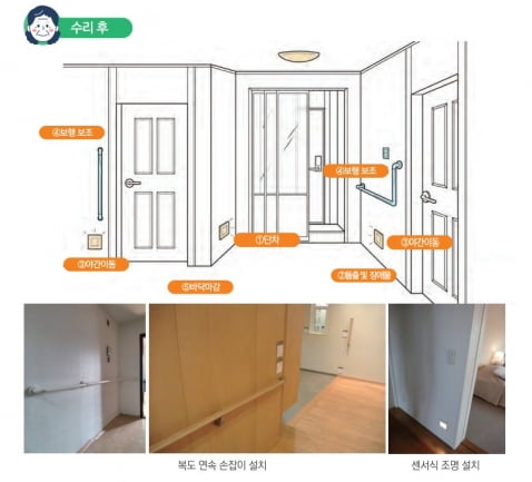집수리에 앞서 노화에 따른 신체 기능의 변화를 파악하는 것이 중요하다. 허리가 굽는 등 자세가 변했을 땐 수납공간, 스위치 등의 높이를 조정해야 한다. 근육량이 줄고 뼈가 약해지기 때문에 계단 및 단차를 최소화하는 것도 중요하다. 감각 기관 둔화에 따른 가스·화재 경보기, 안전 손잡이 등을 설치하는 것도 한 방법이다.