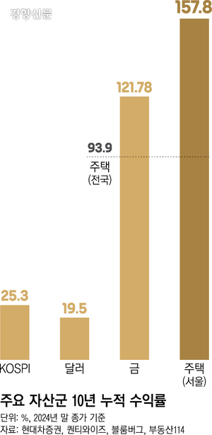 실제 수익률을 보더라도 서울 부동산은 다른 금융자산을 압도한다. 현대차증권이 부동산114, 블룸버그의 자료를 토대로 분석한 결과, 지난해 말 기준 서울 주택의 10년 수익률은 157.8%로 코스피지수의 6배, 미국 달러의 8배에 달했다.