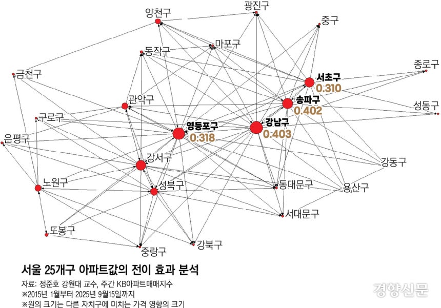 강남의 아파트값 변동이 주변 지역으로 확산 또는 전이되는 이른바 ‘강남 효과’가 실재하는 것이다. 정준호 강원대 부동산학과 교수가 주간 KB아파트매매지수를 활용해 2015년 1월부터 지난달 15일까지 10년간 서울 25개구 아파트값 전이지수를 산출한 결과, 다른 자치구에 미치는 가격 영향 정도를 나타내는 ‘외향 중심성’이 가장 큰 자치구는 강남구(0.403)였고 그다음으로는 송파구(0.402)였다.
