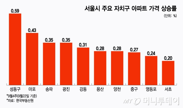 한국부동산원이 최근 발표한 '9월 넷째주(9월 22일 기준) 주간 아파트 가격 동향'에 따르면 서울 아파트 가격은 전주(0.12%) 대비 0.19% 올라 상승폭을 3주 연속 키웠다. 강남3구와 용산구는 물론 성동·마포·강동 등 주요 지역이 일제히 오름세를 보였다. 신고가 거래도 속출했다. 그러자 일부 수요자들 사이에서는 '지금 아니면 못 산다'는 불안 심리가 확산했다.