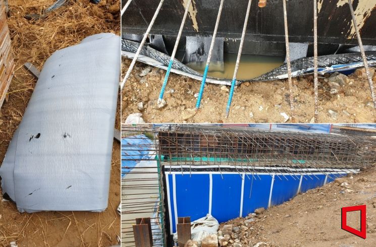 경기 LH 아파트 건설 현장. (맨왼쪽)지하주차장 외벽 방수에 쓰일 시트 자재가 찢기고 구겨진 채 방치돼 있다. (오른쪽 상단)외벽 방수 시공 후 끝단 마감이 누락돼 시트가 들뜨고, 내부에 빗물이 고인 모습. 비가 내리자 외벽을 타고 스며든 물이 시트 안쪽에 고여 방수층 전체가 손상됐다. (오른쪽 하단)LH 품질명장이 해당 부위를 확인한 뒤 전체적으로 다시 걷어내고 보수해야 한다고 지적해 재시공한 구간으로, 손상된 구간을 걷어내고 끝단을 스테인리스 판으로 고정한 뒤 새 시트를 부착한 모습. 파란색 보호판을 덧대 흙을 되메움할 때 방수층이 다시 손상되지 않도록 마감했다.철판 3.2㎜라더니 2.8㎜…LH 품질명장이 잡아낸 현장 '꼼수'