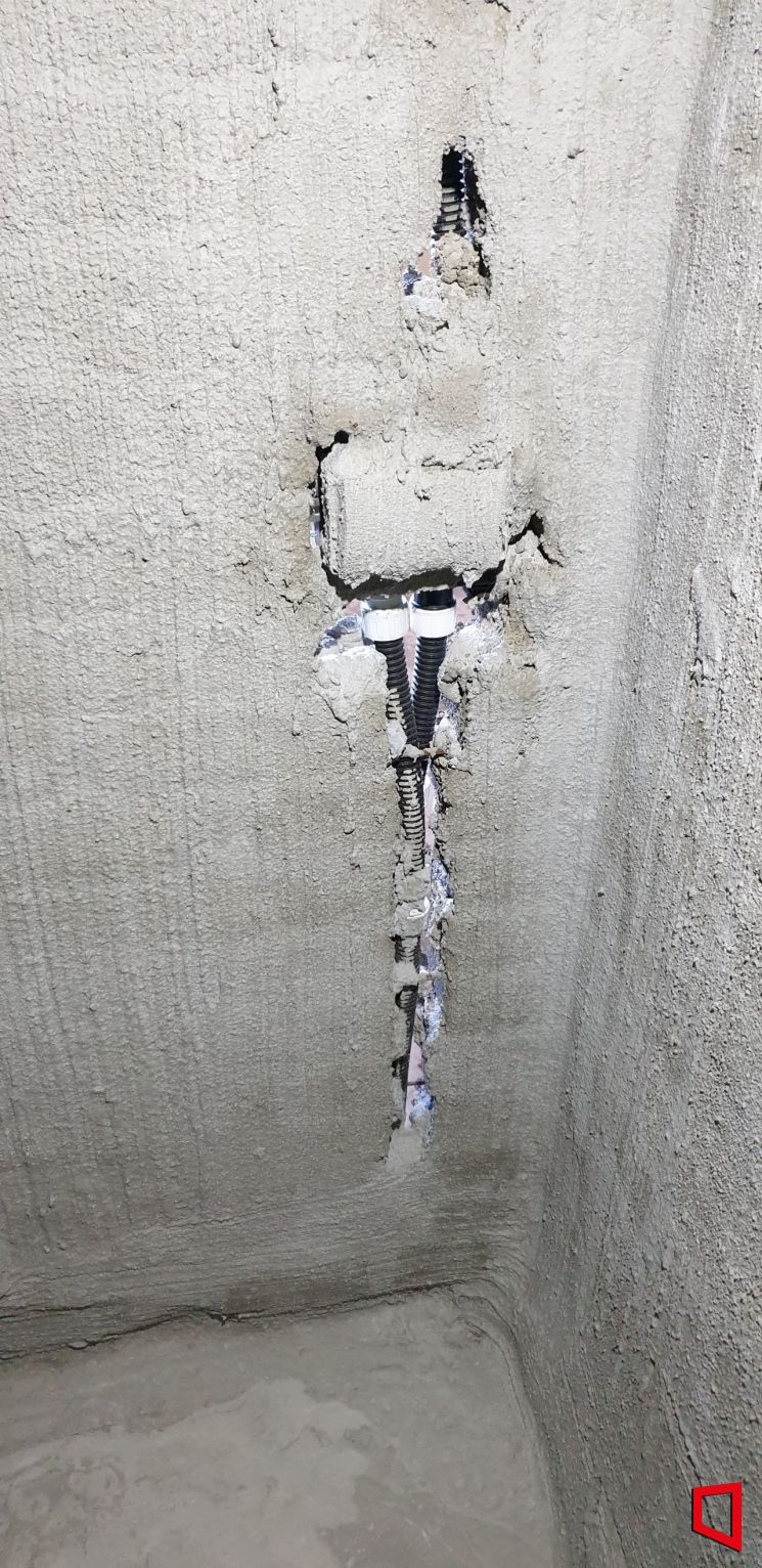 인천 LH 아파트 건설 현장. 욕실 벽체 내부 전선관과 배관 매립 부위가 시멘트 사춤(틈 메우기)이 누락된 채 그대로 노출된 모습. 이는 방수 전에 반드시 이뤄져야 하는 선행 공정이 제대로 이행되지 않은 상태로, 벽체 틈으로 물이 스며들면 누수·결로·누전 등 2차 하자로 이어질 수 있다.