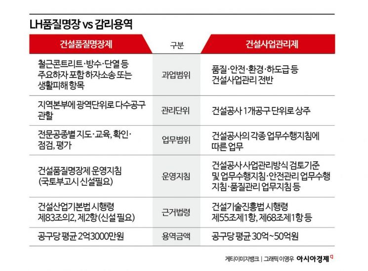 명장제는 건설산업기본법을 근거로 시행령에 담는 작업이 추진됐으나 흐지부지된 상황이다. LH 관계자는 "올해 사업은 종료됐고 감리와 역할이 겹친다는 내부 의견이 있었다"며 "품질 명장의 과업 범위를 조정해 내년부터는 다른 제도로 재편할 계획"이라고 말했다.