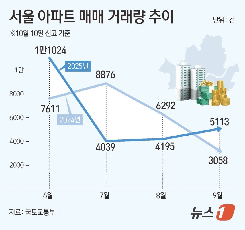 ⓒ News1 김초희 디자이너(서울=뉴스1) 김종윤 기자 = 서울 아파트 매매가 한강벨트를 중심으로 다시 뜨거워지고 있다. 지난달 서울 아파트 거래 건수는 5000건을 돌파하며, 정부의 추가 규제 가능성 이전에 매수하려는 '패닉 바잉' 현상이 뚜렷하게 나타났다. 특히 강남3구보다는 마포·용산·성동(마·용·성) 등 한강벨트 지역으로 매수가 집중되는 모습이다.추가 규제 가능성에 선매수 움직임10일 국토교통부실거래가시스템에 따르면 9월 서울 아파트 거래량(10일 신고 기준·계약해제 제외)은 5113건으로 집계됐다.
