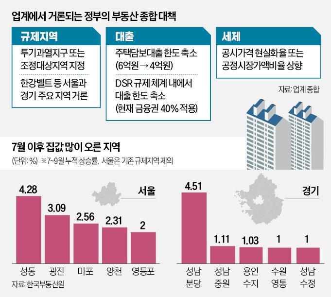 정부가 이번주 부동산 시장 안정화 대책을 추가 발표한다. 서울 마포와 성동, 경기 성남 분당 등을 투기과열지구나 조정대상지역으로 묶고 현재 6억원인 대출 한도를 4억원으로 더 조이는 방안 등이 유력하게 거론된다.