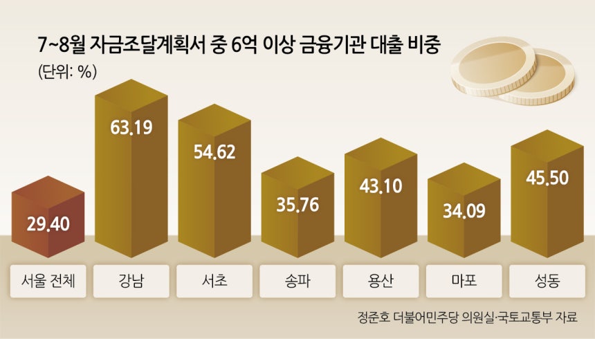 정부가 6·27 대출 규제를 시행한 후에도, 고소득자는 6억 이상 대출을 일으켜 주택 매수에 나선 것으로 나타났다. 서울에선 자금조달계획서 제출 거래 중 30%가 6억 이상 대출을 받았다. 사진은 서울 용산구 한강공원에서 바라본 서초구의 한 아파트 건설현장 모습. 임세준 기자특히 강남3구(강남·서초·송파)와 용산구 등 고가 주택과 고소득자가 모여있는 지역일수록 6억원 이상의 대출을 받은 비중이 높았다. 강남의 경우 63%가 금융기관으로부터 6억원 이상의 대출을 받았다. 이외에도 서초 54%, 성동 45%, 용산 43%, 중구 41%, 송파 35% 등의 순이었다.