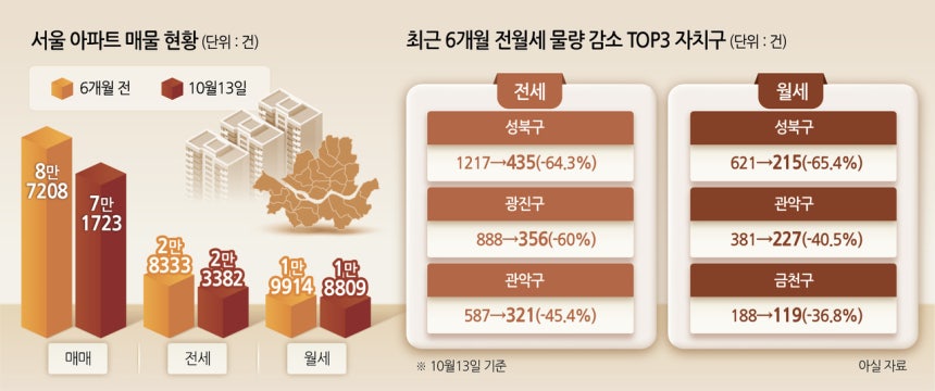 [헤럴드경제=김희량 기자] #. 서울 관악구 봉천동 관악드림타운의 14일 기준 전세 매물은 27건으로 1년 전(47건) 대비 절반 수준이다. 반면 거래량은 9월 말 누적 194건으로 1년 전 동기 대비 60% 늘며 매매 매물 수(116→64)도 동시에 급감했다.