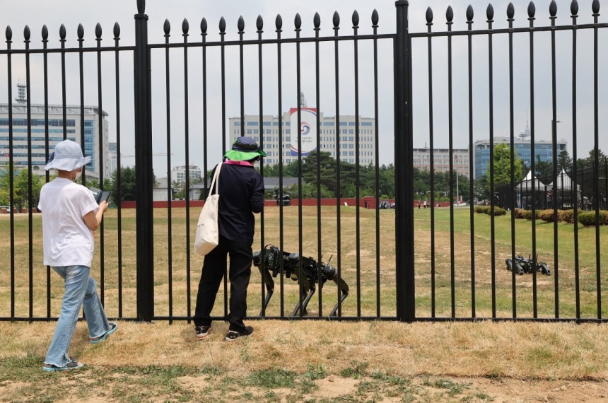 서울 용산구 용산공원에서 대통령실 앞뜰을 지키는 로봇개가 이동하고 있다. 사진=한경DB