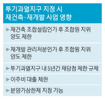 투기과열지구로 지정되면 조합원 지위 양도가 제한된다. 재건축은 조합 설립 이후부터, 재개발은 관리처분계획 인가 이후부터 적용되는데 5년 거주, 10년 이상 보유한 자 등 일정 요건을 충족하지 않으면 지위 양도가 등기 이전 때까지 제한된다.