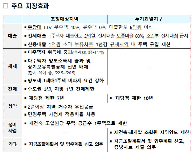 조정대상지역·투기과열지구로 지정되면 대출·세제·청약 등 주택시장 전반의 진입 장벽이 높아진다. 우선 주택구매목적 주택담보인정비율(LTV)이 무주택자는 기존 70%에서 40%로 낮아지게 되고, 주택 보유자는 LTV 0%로 원칙적으로 대출이 불가능하다. 대출 한도는 최대 6억원까지다. 무주택자가 서울 등 규제지역 내 15억원짜리 주택을 매입할 때 주담대를 6억원까지만 받을 수 있게 되는 것이다.