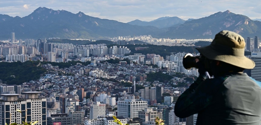 서울 전역 및 경기 12개 지역을 규제지역 지정하고 LTV 40%로 축소하는 10.15 부동산 대책이 발표된 가운데 15일 오전 서울 남산에서 한 시민이 서울 시내 아파트를 바라보고 있다. 이상섭 기자