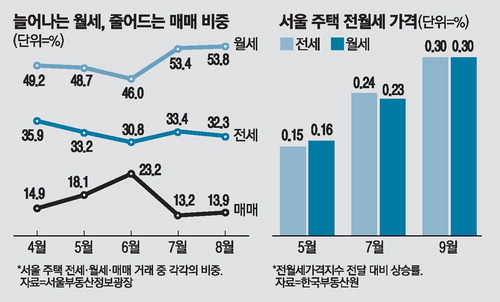 서울부동산정보광장에 따르면 지난 8월 서울 주택 거래에서 전월세 거래 비중은 86.1%에 달했다. 6월(76.8%) 대비 두 달 만에 10%포인트 가까이 오른 수치다.