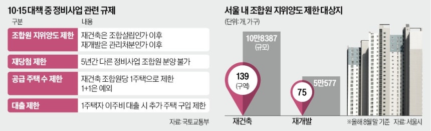 정부가 서울 전역과 경기도 12개 지역을 조정대상지역, 투기과열지구, 토지거래허가구역으로 묶은 ‘10·15 부동산대책’을 내놓자 수도권 정비사업장이 큰 혼란에 빠졌다. 서울에서만 214곳(15만8964가구)의 재건축·재개발 현장에서 조합원 지위양도가 제한돼 재산권 피해가 예상된다. ‘규제 확대→사업 지연→주택 공급 위축→부동산 시장 불안 심화’로 이어질 수 있다는 우려도 나온다. ◇서울에서만 16만 가구 타격