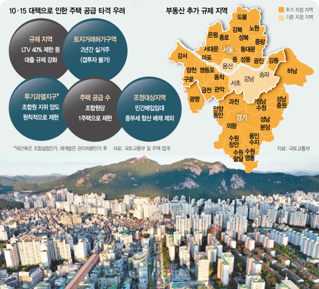 정부가 서울 전역과 경기 12개 지역을 대상으로 단행한 ‘10·15 주택 시장 안정화 대책’이 주택 공급 분야에도 파장을 일으키고 있다. 재건축·재개발 매물 거래가 어려워지는 것은 물론 민간 매입임대에 대한 세제 혜택도 줄어들어 아파트와 비(非)아파트 공급이 모두 악영향을 받을 것으로 전망된다. 정부는 기존의 공급 대책을 조속히 이행하겠다는 입장이지만 업계에서는 수요를 틀어막은 상태에서 공급을 활성화하기는 어렵다는 지적이 나온다.