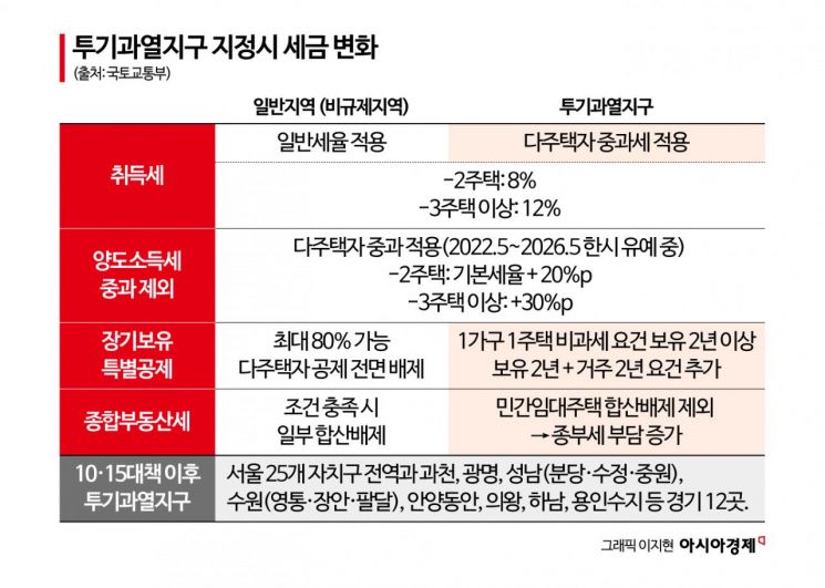 이번 조치로 서울 25개 자치구와 과천·광명·성남(분당·수정·중원)·수원(영통·장안·팔달)·안양동안·의왕·하남·용인수지 등 경기 12곳이 투기과열지구로 편입됐다. 투기과열지구에서 다주택자의 취득세율은 2주택 8%, 3주택 이상 12%로 중과된다. 양도소득세도 2주택은 20%포인트, 3주택은 30%포인트를 가산한다. 종합부동산세의 민간임대주택 합산배제도 제외돼 세 부담이 커진다. 장기보유특별공제는 다주택자에게 전면 배제된다.