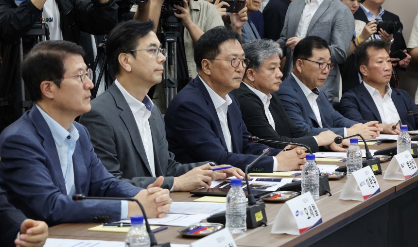 2025년 8월 14일 서울 중구 직업능력심사평가원에서 열린 중대재해 근절을 위한 건설사 간담회에 참석한 건설사 CEO들이 김영훈 고용노동부 장관의 발언을 듣고 있다. / 연합뉴스