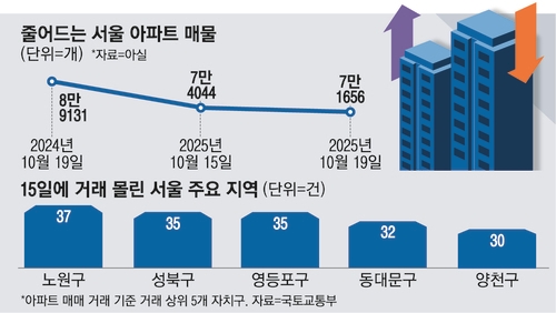 매수 문의는 끊겼는데 집주인들은 오히려 호가를 높이거나 매물을 거두고 있어 거래 절벽 현상이 나타날 가능성이 제기된다. 부동산 플랫폼 아실에 따르면 규제 발표날(10월 15일) 7만4044개였던 서울 아파트 매물은 19일 7만1656개로 줄었다. 1년 전 같은 날(8만9131건) 대비로는 20% 가까이 감소했다.