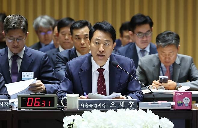 오세훈 서울시장이 20일 오전 서울시청에서 열린 국토교통위원회 국정감사에서 발언하고 있다. [연합]
