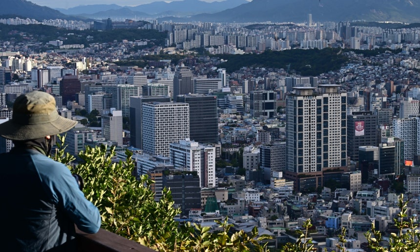 서울 전역 및 경기 12개 지역을 규제지역으로 지정하고 주택담보대출비율(LTV) 40%로 축소하는 10·15 부동산 대책이 발표된 가운데 15일 오전 서울 남산에서 한 시민이 서울 시내 아파트를 바라보고 있다. 이상섭 기자