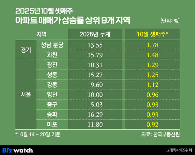 2025년 10월 셋째주 아파트 매매가 상승률 상위 지역/그래픽=비즈워치다만 전문가들은 본격적인 토허구역 지정 효과가 반영된 20일 이후부터는 거래가 줄면서 상승세가 소강상태에 놓일 것으로 봤어요. 규제 여파가 임대차 시장에 악영향을 미칠 것으로 예상되면서 시장 안정화가 쉽지 않을 것이란 분석이 나와요. 규제 직후 더 올랐다 한국부동산원은 10월 셋째 주(20일 기준) 서울 아파트 매매가격이 전주 대비 0.5% 상승했다고 밝혔어요. 지난주(0.54%)와 비교하면 상승폭이 다소 줄어든 것처럼 보이지만요. 추석 연휴로 인해 지난주 변동률이 2주간 누계치인 점을 감안하면 사실상 10·15 대책 발표 후 상승폭이 더 커진 셈이에요.