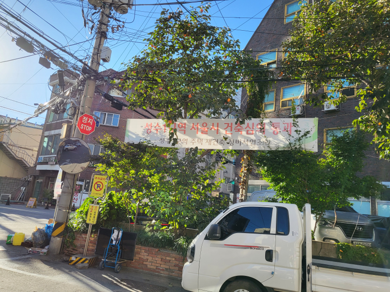 성수제1구역주택재건축정비사업 현수막. [사진 이승훈 기자]사업성 악화·착공 지연…시장 위축 악순환