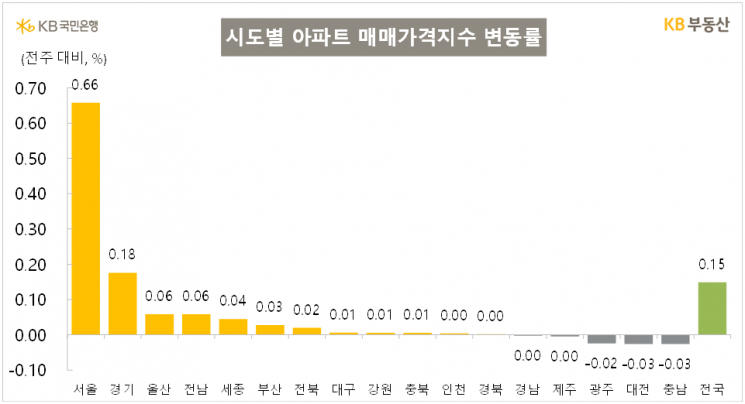 서울 아파트 매매가격은 0.66% 올랐다. 수도권(0.29%)은 경기(0.18%)는 상승하고, 인천(0.00%)은 보합을 기록했다.