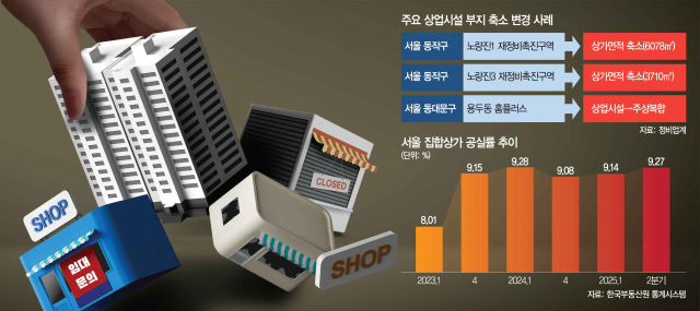 경기 불황에 상가 시설 공실률이 증가하면서 상업시설이 설 자리를 잃었다. 소비 방식이 매장을 찾는 현장 구매가 아닌 전자 상거래 등 비대면 거래가 늘어남에 따라 기존 상업시설 자리는 아파트와 주상복합 등 공동주택 용지로 변경되고 있다. 이에 따라 재건축·재개발 사업장도 기존 상가 면적을 축소하고 분양 면적을 늘리며 사업계획을 변경하고 나섰다.