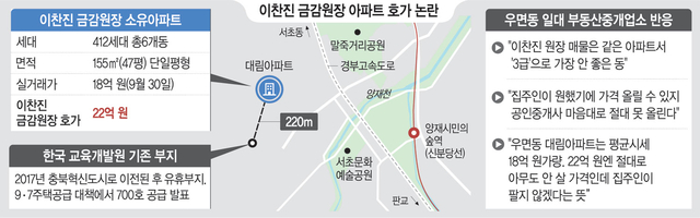 비싼 호가 탓에 매도 진정성 논란도 커지고 있다. 전날 방문한 우면동 A부동산중개업소 대표는 “대림아파트는 실거래가가 18억 원인데 지금 시황에서 22억 원으로 내놓으면 아무도 사지 않는다”며 “이 원장이 ‘보여주기식’으로 매물을 내놓은 것 아니겠냐”고 말했다. 국토교통부 실거래가시스템에 따르면 같은 아파트 매물은 지난 9월 30일 18억 원에 팔렸다.