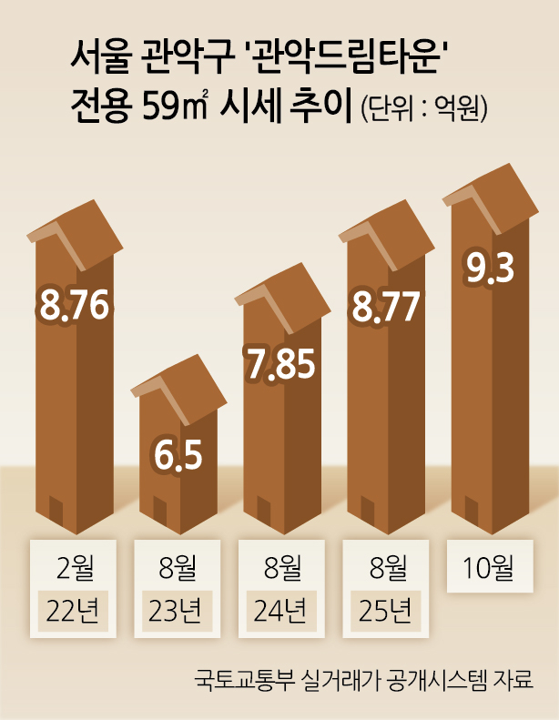 30일 국토교통부 실거래가 공개시스템에 따르면 서울 관악구 봉천동 ‘관악드림타운’ 59㎡(이하 전용면적)가 이달 9억3000만원(16층)에 거래됐다. 해당 평형은 2021년 8월 9억2400만원(15층) 거래 이후 4년여 만에 신고가를 경신했다. 당시 부동산 과열기 고점을 다시 뚫은 것이다.